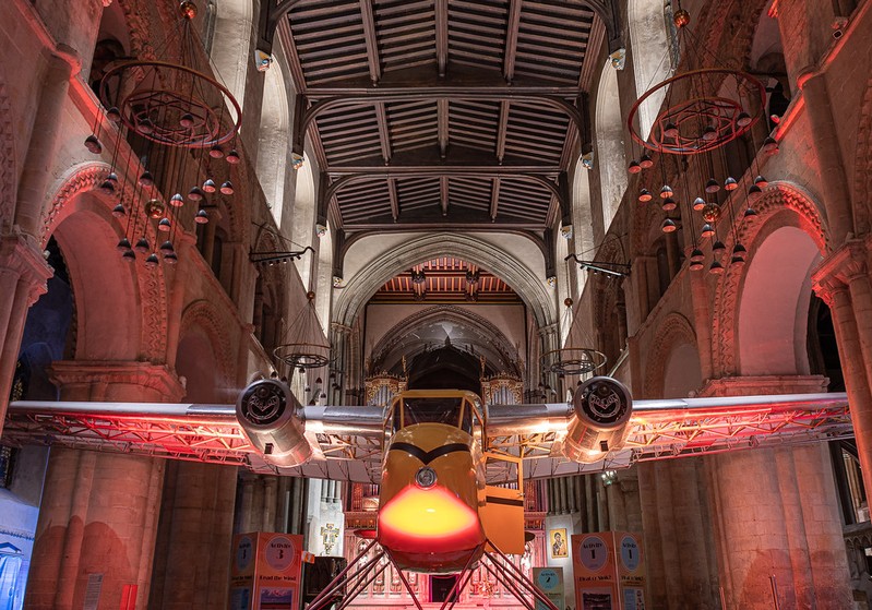 What an interesting installation which begs the question of how it was put in there? The converging verticles give a sense of size to this and I like the colours from the artificial lighting. It is a shame that the bottom of the aircraft has been cropped off but there could be a good reason for this. Rochester Cathedral certainly has some great exhibitions and well done to the photographer for capturing this for posterity. |