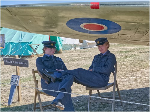 I would imagine these two ladies were sweltering in those uniforms on that day so where better to shelter than underneath a Spitfire wing? The photographer has actually balanced the exposure well because it could have been all to easy to have the areas in sunlight too bright. The rope is a distraction but that would be difficult to avoid in this situation. Well seen and well taken. |
